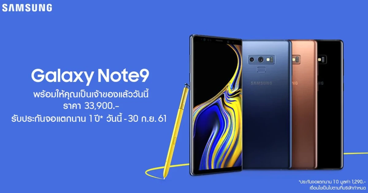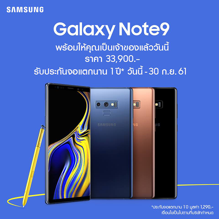 Samsung Galaxy Note 9 มีมาให้เลือก 3 สีด้วยกัน ได้แก่ สีโอเชี่ยนบลู (Ocean Blue) ที่มาพร้อมกับ S Pen สีเหลือง สีเมทัลลิก คอปเปอร์ (Metallic Copper) และสีมิดไนท์ แบล็ค (Midnight Black) วางจำหน่ายในราคาเครื่องละ 33,900 บาท รับฟรีทันที ! ประกันจอแตกนาน 1 ปี (นับจากวันที่ซื้อ)