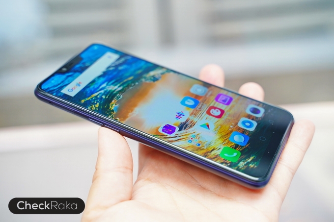 - OPPO A3s ดีไซน์ขอบกระจก 2.5D หน้าจอ IPS ขนาด 6.2 นิ้ว อัตราส่วน 19:9 มีติ่งบนหน้าจอ หน้าจอมีพื้นที่คิดเป็น 88.8% ของพื้นที่หน้าจอทั้งหมด ความละเอียด HD+ 720 x 1520 pixels หน้าจอคมและสวยมาก แถมยังสู้แสงได้ดี สามารถใช้งานกลางแจ้งได้อย่างสบายๆ และขอบหน้าจอบางมาก น้ำหนักเบาๆ พกพาสะดวกเพียงแค่ 168 กรัม