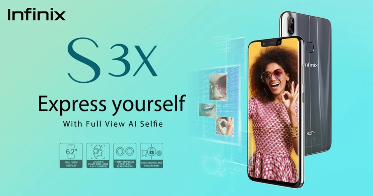 Infinix S3X มาพร้อมดีไซน์ Unibody ฝาหลังแบบมันวาว หน้าจอ IPS อัตราส่วน 19:9 มีติ่งบนหน้าจอ ขนาด 6.2 นิ้ว ความละเอียด HD+ 1500 x 720 pixels, ทำงานบน Android 8.1 Oreo ครอบทับด้วย XOS 3.3, ชิปเซ็ต Qualcomm Snapdragon 430, RAM 3GB, ROM 32GB รองรับ MicroSD 128GB, มีระบบสแกนใบหน้า กับเซ็นเซอร์สแกนลายนิ้วมือ, กล้องคู่ความละเอียด 13MP + 2MP, มาพร้อมกล้องหน้า AI Selfie กล้องหน้าความละเอียด 16MP, แบตเตอรี่ความจุ 4,000 mAh รองรับเทคโนโลยีชาร์จเร็ว อะแดปเตอร์สามารถจ่ายไฟแบบ 5V/2A