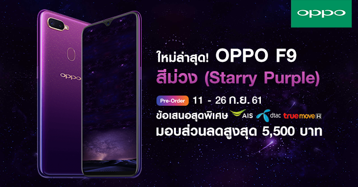 โปรโมชั่นสุดพิเศษจาก AIS, TrueMove H และ dtac จอง OPPO F9 Starry Purple รับส่วนลดสูงสุด 5,500 บาท พร้อมของขวัญสุดพิเศษอีกมากมาย ตั้งแต่วันนี้ - 26 ก.ย. นี้ สำหรับรายละเอียดโปรโมชั่นต่างๆ มีดังนี้