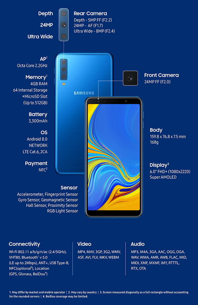 สำหรับรายละเอียดสเปคอื่นๆ ของ Samsung Galaxy A7 (2018) มีดังนี้