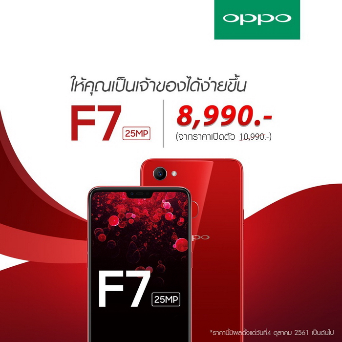 สามารถเป็นเจ้าของ OPPO F7 ที่ OPPO Shop และร้านค้าชั้นนำทั่วประเทศ ราคานี้มีผลตั้งแต่วันที่ 4 ต.ค. 2561 เป็นต้นไป