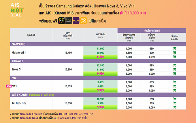 เป็นเจ้าของ Samsung Galaxy A8+, Huawei Nova 3, Vivo V11 และ AIS | Xiaomi Mi8 ราคาพิเศษ รับส่วนลดค่าเครื่องทันที 10,000 บาท พร้อมชมฟรี AIS Play, Play Premium, HOOQ และ Viu ไม่คิดค่าเน็ต