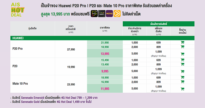 เป็นเจ้าของ Huawei P20 Pro และ Huawei P20 และ Huawei Mate 10 Pro ราคาพิเศษ รับส่วนลดค่าเครื่องสูงสุด 13,995 บาท พร้อมชมฟรี AIS Play, Play Premium, HOOQ และ Viu ไม่คิดค่าเน็ต