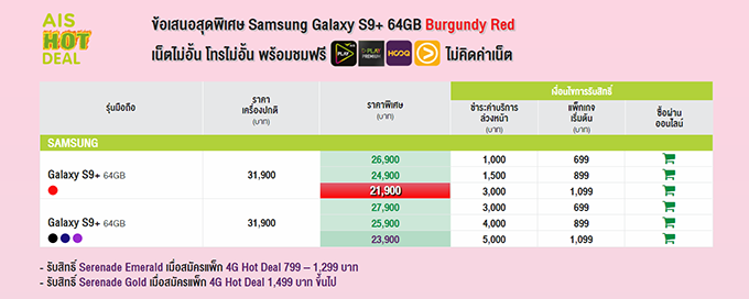 ข้อเสนอสุดพิเศษ Samsung Galaxy S9+ 64GB Burgundy Red เน็ตไม่อั้น โทรไม่อั้น พร้อมชมฟรี AIS Play, Play Premium, HOOQ และ Viu ไม่คิดค่าเน็ต