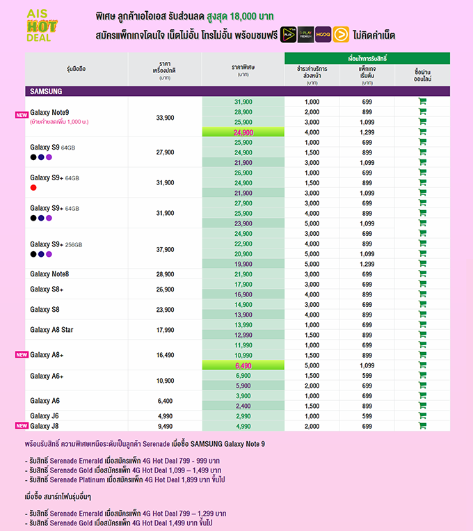 - Samsung Galaxy Note9 (128GB) ราคาพิเศษเพียง 24,900 บาท (จากราคาปกติ 33,900 บาท)