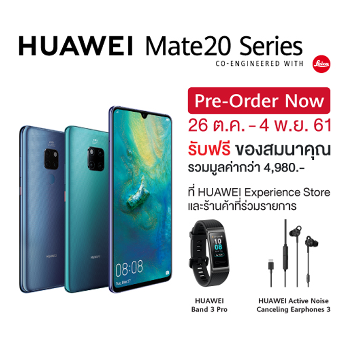 โดยลูกค้าที่สนใจสามารถสั่งจองได้ในระหว่างวันที่ 26 ตุลาคม - 4 พฤศจิกายนนี้ พิเศษ! รับของสมนาคุณ HUAWEI Band 3 Pro และ HUAWEI Active Noise Canceling Earphones 3 มูลค่ารวม 4,980 บาท สำหรับร้านค้าที่ร่วมรายการ หรือรับส่วนลดสูงสุด 15,000 บาท เมื่อสมัครแพคเกจกับผู้ให้บริการเครือข่ายโทรศัพท์เคลื่อนที่