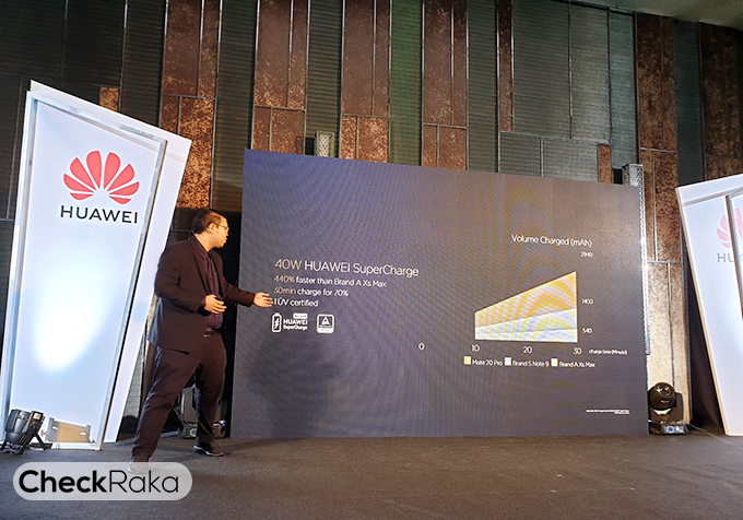 นวัตกรรม HUAWEI SuperCharge ที่ให้กำลังไฟฟ้าได้ถึง 40 วัตต์ โดยสามารถชาร์จแบตเตอรี่ของ HUAWEI Mate 20 Pro ได้ถึง 70% หรือประมาณ 2,940 mAh ได้ภายในเวลาเพียง 30 นาที โดยเทคโนโลยีนี้ได้รับการรับรองความปลอดภัยขั้นสูงสุดจากสถาบัน TUV Rheinland