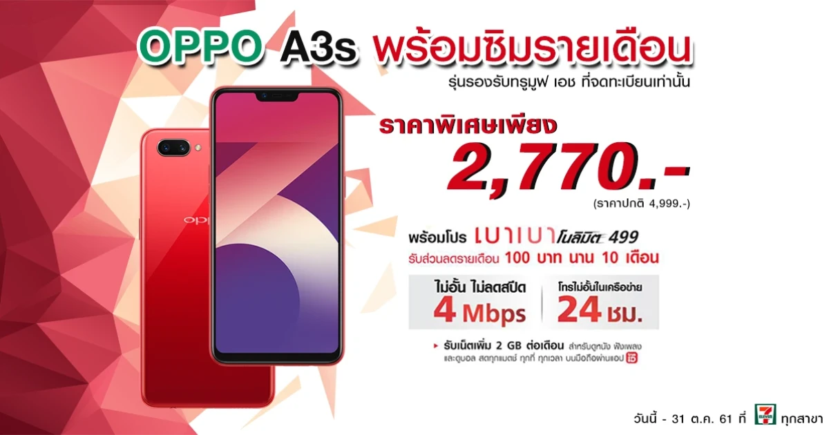 ข้อเสนอสุดคุ้ม เกินห้ามใจ หาซื้อได้ใกล้บ้านคุณ เป็นเจ้าของเครื่อง OPPO A3s พร้อมซิมรายเดือนราคาประหยัดได้แล้วที่ 7-Eleven ทุกสาขา ตั้งแต่วันที่ 1 ตุลาคม - 31 ธันวาคม 2561