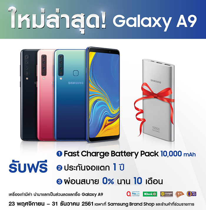 "ซัมซุง กาแลคซี่ เอ 9" วางจำหน่ายอย่างเป็นทางการในไทย วันที่ 23 พฤศจิกายน นี้ ทั้งหมด 3 สี ได้แก่ สีดำ คาเวียร์ แบล็ค (Caviar Black), สีน้ำเงิน เลมอนเนด บลู (Lemonade Blue) และสีชมพู บับเบิ้ลกัม พิงค์ (Bubblegum Pink) ในราคา 19,990 บาท รับฟรีทันที ! Fast Charge Battery Pack ความจุ 10,000 mAh ประกันจอแตก 1 ปี พร้อมผ่อนสบาย 0% นาน 10 เดือน และโปรโมชั่นพิเศษ สามารถนำเครื่องเก่ามาแลกเป็นส่วนลดแลกซื้อ ซัมซุง กาแลคซี่ เอ 9 ได้ตั้งแต่วันที่ 23 พฤศจิกายน - 31 ธันวาคม 2561 เฉพาะที่ Samsung Brand Shop และร้านค้าที่ร่วมรายการ