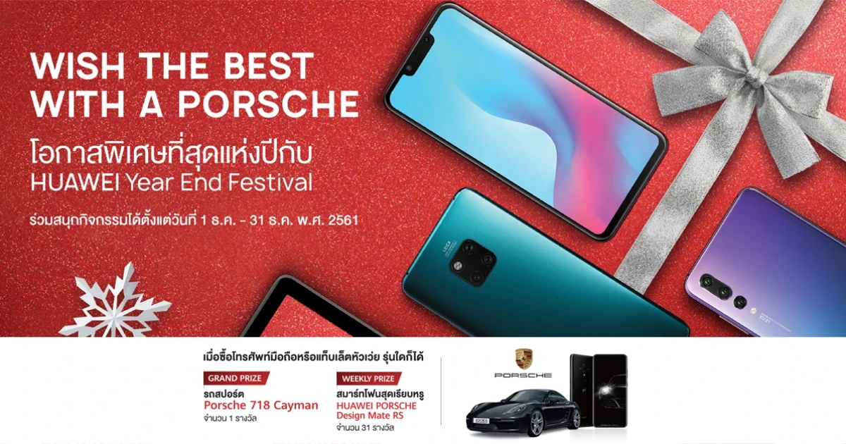 ไม่มีโปรโมชั่นไหนร้อนแรง และพรีเมี่ยมไปกว่านี้แล้วครับ! หัวเว่ย จัดแคมเปญส่งท้ายปี HUAWEI Year End Festival ต้อนรับเทศกาลแห่งการให้ จัดสมาร์ทโฟนและแท็บเล็ตรุ่นยอดฮิตมาลดแลกแจกแถม พร้อมมอบของขวัญสุดพรีเมี่ยมรวมมูลค่ารวมทั้งสิ้นกว่า 8 ล้านบาท เมื่อซื้อโทรศัพท์มือถือหรือแท็บเล็ตหัวเว่ยรุ่นใดก็ได้ ลุ้นเป็นเจ้าของรางวัลใหญ่ รถสปอร์ต Porsche 718 Cayman สี Black Metallic จำนวน 1 รางวัล มูลค่า 6,600,000 บาท พร้อมลุ้นรางวัลสมาร์ทโฟนหัวเว่ยสุดหรู อย่าง HUAWEI Porsche Design Mate RS ทุกสัปดาห์ จำนวน 31 รางวัล มูลค่ารางวัลละ 54,990 บาท ตั้งแต่วันที่ 1 - 31 ธันวาคมนี้เท่านั้น!