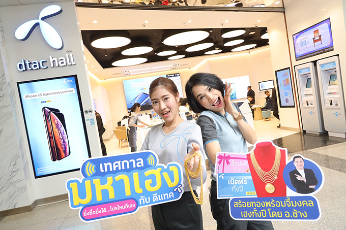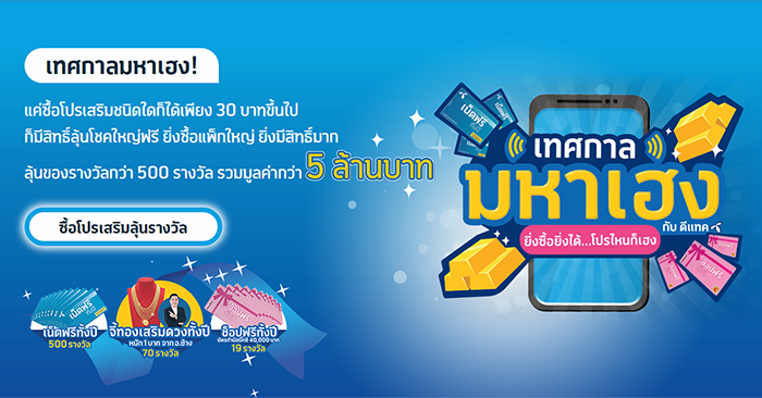 ดีแทค จัดโปรโมชั่นใหญ่ ให้ลูกค้าได้ลุ้นรับโชคกับ 'เทศกาลมหาเฮง' เฮงทั้งปี ส่งท้ายปีเก่า ต้อนรับปีใหม่ ลูกค้าดีแทค ลุ้นได้ง่ายๆ เฮงๆ ยาวๆ ไปจนถึงตรุษจีนปี 2562 พิเศษสุด สำหรับลูกค้าดีแทคแบบเติมเงินและรายเดือน เพียงซื้อโปรเสริม ทุกๆ 30 บาท รับ 1 สิทธิ์ ต่อการซื้อ 1 แพ็กเกจ เริ่มรับสิทธิ์ลุ้นได้ตั้งแต่วันที่ 3 ธันวาคม 2561 - 12 กุมภาพันธ์ 2562 แจกรางวัลทุก 2 สัปดาห์ กับรางวัลสุดเฮง 1.) สร้อยคอทองคำพร้อมจี้ทองหนัก 1 บาท เสริมดวงทั้งปี! จากหมอช้าง ทศพร ศรีตุลา 2.) ช้อปฟรีทั้งปี! บัตรกำนัล Big C มูลค่า 40,000 บาท และ 3.) เน็ตฟรีทั้งปี! ฟรีอินเตอร์เน็ต 12 เดือน มูลค่า 6,000 บาท รวมมูลค่าของรางวัลทั้งหมดกว่า 5 ล้านบาท จำนวนรางวัลรวมกว่า 500 รางวัล