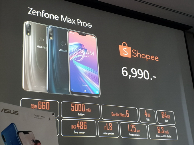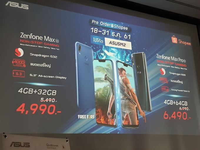 - รุ่น Ram 4 Rom 32 จะวางจำหน่ายผ่านเว็บไซต์ Shopee เท่านั้น ในราคา 5,490 บาท (ผู้ที่สั่งจองในช่วง Pre-order ระหว่างวันที่ 18-31 ธันวาคม 61 ใช้ Code "Asusm2" รับส่วนลด 500 บาท)