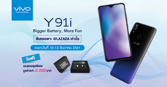 Vivo Y91i มาพร้อมดีไซน์แบบไล่โทนสี มีให้เลือก 2 สี ได้แก่ สีน้ำเงิน และสีแดง วางจำหน่ายเฉพาะใน Lazada เท่านั้น ตั้งแต่วันที่ 10 - 12 ธ.ค. 61 ราคาเปิดตัว 4,999 บาท พิเศษรับแถมมูลค่ากว่า 2,000 บาท ได้แก่ลำโพงพกพา JBL และ Vivo Premium Gift Sets เข้าไปสั่งซื้อได้ในลิงค์สีส้มได้เลยครับ