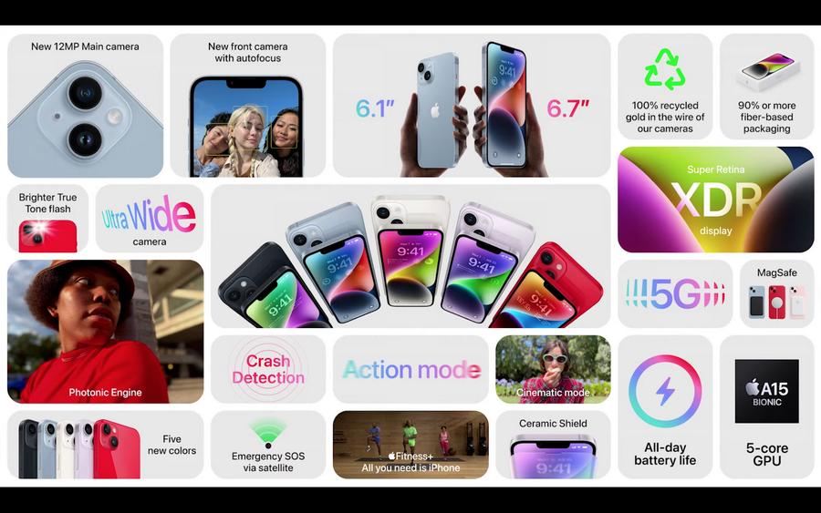 ส่วนความสามารถด้านความปลอดภั ยใหม่ๆ ที่สำคัญต่อชีวิต อย่างการตรวจจับการชนกัน ก็จะช่วยผู้ใช้ iPhone ต่อสายถึงบริการฉุกเฉินในยามที่ ต้องการ และยังมีชิป A15 Bionic พร้อม GPU แบบ 5-core, จอภาพ Super Retina XDR ที่สวยสดงดงาม, แบตเตอรี่ที่ใช้งานได้นานอย่ างน่าทึ่ง, คุณสมบัติด้านความทนทานชั้ นแนวหน้าของอุตสาหกรรม และ 5G ที่เร็วสุดขั้ว ทำให้วันนี้เรามีกลุ่มผลิตภัณฑ์ iPhone ที่ล้ำหน้ายิ่งกว่าที่เคย กับ iPhone 14 และ iPhone 14 Plus ที่มีให้เลือกใน 5 สีสันสวยงาม ได้แก่ สีมิดไนท์ สีฟ้า สีสตาร์ไลท์ สีม่วง และรุ่น PRODUCT(RED)