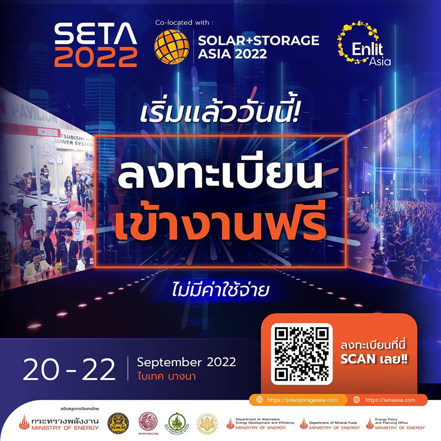 ผู้ที่สนใจ สามารถลงทะเบียนเข้าร่วมงานพลังงานและเทคโนโลยีแห่งเอเชียประจำปี 2565 หรือ SETA 2022 เพื่อรับฟัง และแลกเปลี่ยนองค์ความรู้กับบุคลากรในวงการอุตสาหกรรมพลังงาน พร้อมทั้งรับชมเทคโนโลยีต่าง ๆ จากกว่า 350 บริษัท ได้ที่ setaasia.com/registration