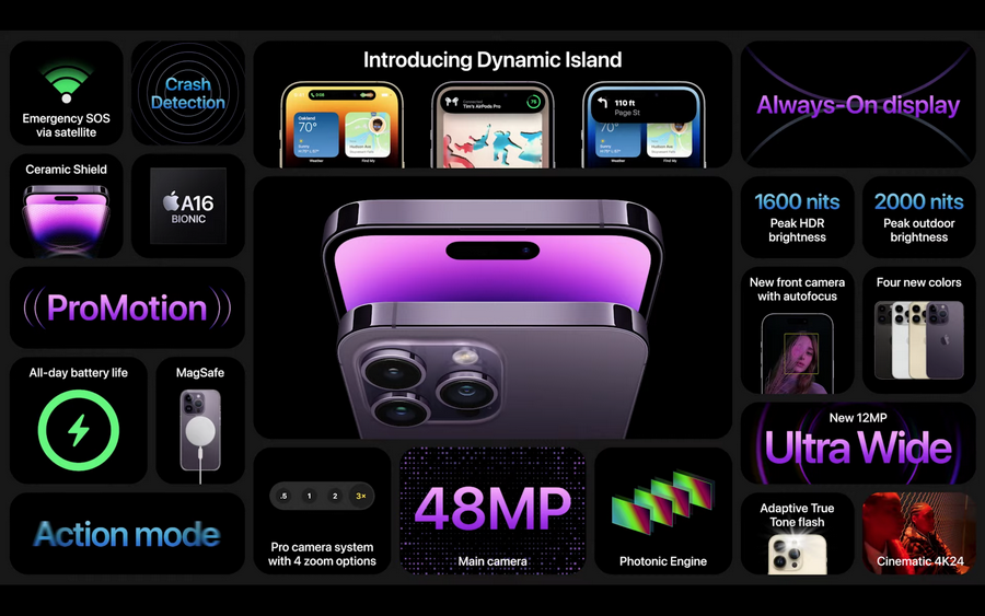 iPhone 14 Pro และ iPhone 14 Pro Max ซึ่งขับเคลื่อนด้วยชิปที่เร็วที่ สุดเท่าที่เคยมีมาในสมาร์ ทโฟนอย่าง A16 Bionic มาพร้อมวิธีใหม่ๆ ที่เป็นธรรมชาติในการสัมผั สประสบการณ์ iPhone, ระบบกล้องระดับโปรที่เหนือชั้ นไปอีกขั้น และความสามารถด้านความปลอดภั ยใหม่สุดล้ำ เริ่มจากระบบกล้องระดับโปรที่ล้ำ หน้ายิ่งขึ้นโดยมาพร้อมกล้องหลั กความละเอียด 48MP เป็นครั้งแรกบน iPhone, กล้องอัลตร้าไวด์ใหม่, กล้องเทเลโฟโต้ และกล้อง TrueDepth ใหม่พร้อมออโต้โฟกัส แถมยังมี Photonic Engine ด้วย จึงเรียกได้ว่าเป็นก้ าวกระโดดครั้งใหญ่สุดเท่าที่ เคยมีมาสำหรับกล้อง