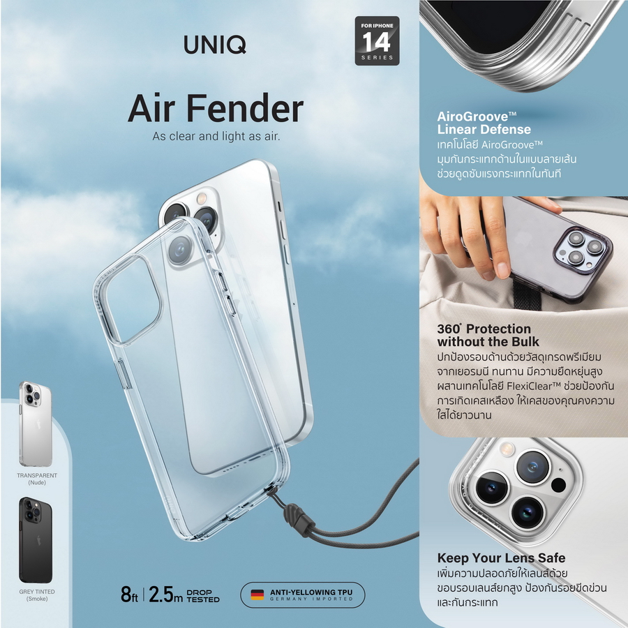 รุ่น AIR FENDER เคสใสที่มาพร้อมความเพรียวบางและเบาดุจอากาศ เสริมการปกป้องด้วยเทคโนโลยี AiroGroove™ ซึ่งเป็นการออกแบบมุมกันกระแทกด้านในแบบลายเส้นเพื่อช่วยดูดซับแรงกระแทกในทันที ผ่านการทดสอบว่าสามารถรองรับแรงกระแทกจากการตกจากที่สูงได้ถึง 8 ฟุต (2.5 เมตร) ผลิตด้วยวัสดุ TPU คุณภาพสูงจากเยอรมนี ทำให้ตัวเคสมีความทนทานและยืดหยุ่นสูง สามารถบิดงอได้ โดยไม่เสียรูปทรง ผสานเทคโนโลยี FlexiClear™ ซึ่งมีคุณสมบัติป้องกันการเกิดเคสเหลือง UNIQ รุ่น AIR FENDER มี 2 สี ได้แก่ สี TRANSPARENT (Nude) และ สี GREY TINTED (Smoke) วางจำหน่ายในราคา 690 บาท