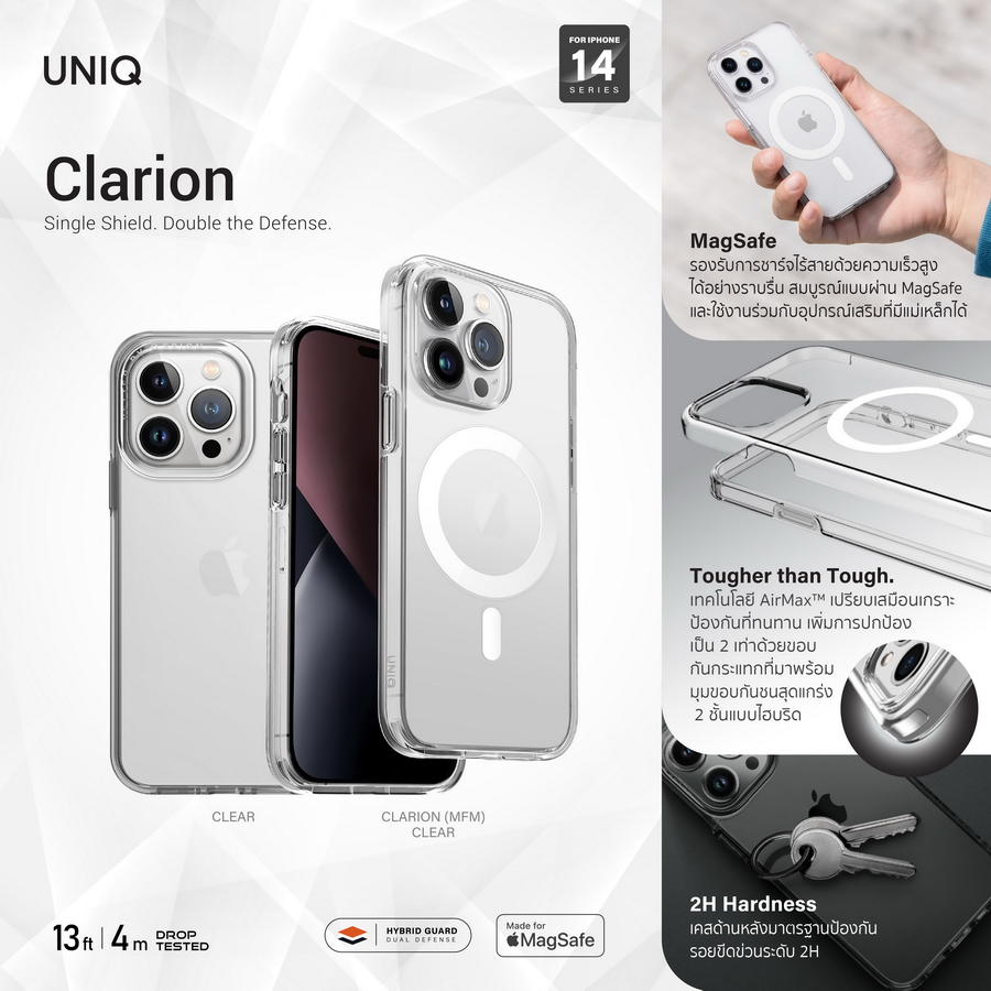 รุ่น CLARION และ รุ่น CLARION (MFM) เคสใสที่มาพร้อมเทคโนโลยี AirMax™ ที่เปรียบเสมือนเกราะป้องกันที่ทนทาน เพิ่มการปกป้องเป็น 2 เท่าด้วยขอบกันกระแทกที่มาพร้อมมุมขอบกันชนสุดแกร่ง 2 ชั้นแบบไฮบริด ตัวเคสผลิตจากวัสดุ TPU และเคสด้านหลังผลิตจากวัสดุ PC มาตรฐานป้องกันรอยขีดข่วนระดับ 2H เคลือบสารป้องกันยูวีและการเกิดเคสเหลืองได้อย่างดีเยี่ยม ผ่านการทดสอบว่าสามารถรองรับแรงกระแทกจากการตกจากที่สูงได้ถึง 13 ฟุต (4 เมตร) เคสรุ่น CLARION (MFM) ได้รับมาตรฐาน MFM (Made for MagSafe ) จาก Apple เพื่อมอบประสบการณ์การใช้งานที่ราบรื่นสำหรับการชาร์จไร้สายผ่าน MagSafe ช่วยให้คุณชาร์จไอโฟนได้ด้วยความเร็วสูง และยังสามารถใช้งานร่วมกับอุปกรณ์เสริมอื่นๆที่มีส่วนประกอบของแม่เหล็กได้ UNIQ รุ่น CLARION มี 1 สี คือ สี CLEAR (Lucent) วางจำหน่ายในราคา 890 บาท และรุ่น CLARION (MFM) มี 1 สี คือ สี CLEAR (Lucent) วางจำหน่ายในราคา 1,390 บาท