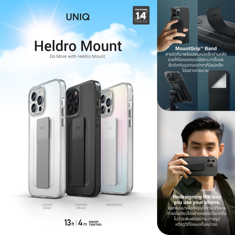 รุ่น HELDRO MOUNT มาพร้อม MountGrip™ สายรัดพร้อมแถบแม่เหล็กด้านหลังที่ได้รับการจดสิทธิบัตร ให้คุณใช้งาน iPhone ด้วยมือเดียวได้อย่างคล่องตัว ไม่ว่าจะเป็นการดูวิดีโอ ถ่ายภาพ รวมถึงสลับการใช้งานระหว่างแอปต่างๆได้อย่างง่ายดาย นอกจากนี้ ยังช่วยให้คุณดูหน้าจอได้สะดวกมากยิ่งขึ้น เพราะสามารถยึดติดเข้ากับอุปกรณ์เสริมในรถหรือยึดติดกับผนังที่มีแม่เหล็กได้ ตัวเคสผลิตจากวัสดุ TPU และ PC ดีไซน์แบบ Quick-release band ช่วยให้เปลี่ยนสีของสายรัดได้อย่างรวดเร็ว พร้อมเพิ่มความปลอดภัยให้เลนส์ด้วยขอบรอบเลนส์ยกสูงและปุ่มสัมผัสที่กดได้ง่าย และยังมีสายคล้องข้อมือปรับระดับได้ที่ออกแบบมาอย่างแข็งแรงเพื่อความปลอดภัยขั้นสุด เพื่อให้คุณใช้งานได้โดยไม่ต้องกลัวการตกหล่น ผ่านการทดสอบว่าสามารถรองรับแรงกระแทกจากการตกจากที่สูงได้ถึง 13 ฟุต (4 เมตร) UNIQ รุ่น HELDRO MOUNT มี 3 สี ได้แก่ สี CLEAR (Lucent), สี BLACK (Vapour) และ สี IRIDESCENT วางจำหน่ายในราคา 1,190 บาท
