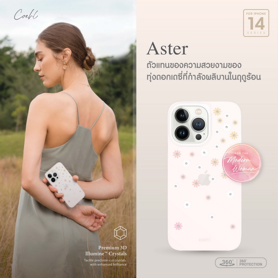 รุ่น Aster เคสใสที่เป็นตัวแทนของความสวยงามของทุ่งดอกเดซี่ที่กำลังผลิบานในฤดูร้อน เพิ่มความหรูหราด้วยเม็ดคริสตัลระดับพรีเมียม 3 มิติที่ฝังอยู่ในตัวเคส ช่วยให้เคสของคุณดูสวยหรูและมีมิติมากยิ่งขึ้น ผลิตจากวัสดุ IML TPU COEHL by UNIQ รุ่น Aster มี 1 สี คือ สี SPRING PINK วางจำหน่ายในราคา 1,390 บาท