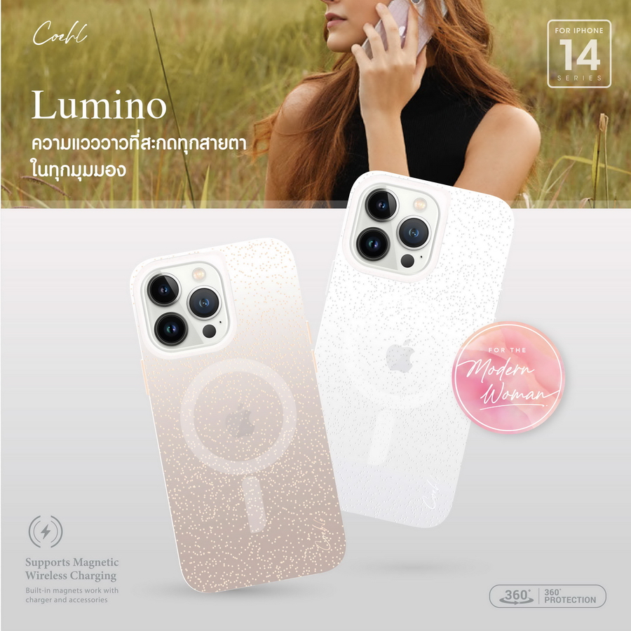 รุ่น Lumino เคสใสที่เพิ่มลูกเล่นด้วยการไล่เฉดสีแบบ Ombre พร้อมสะกดทุกสายตาในทุกมุมมอง ด้านในมีวงแหวนแม่เหล็กช่วยรองรับการชาร์จไร้สายผ่านวงแหวนแม่เหล็ก สามารถยึดติดกับอุปกรณ์เสริมอื่นๆที่มีแม่เหล็กได้ ผลิตจากวัสดุ IML TPU COEHL by UNIQ รุ่น Lumino มี 2 สี ได้แก่ สี CHAMPAGNE GOLD และ สี SPARKLING SILVER วางจำหน่ายในราคา 1,190 บาท