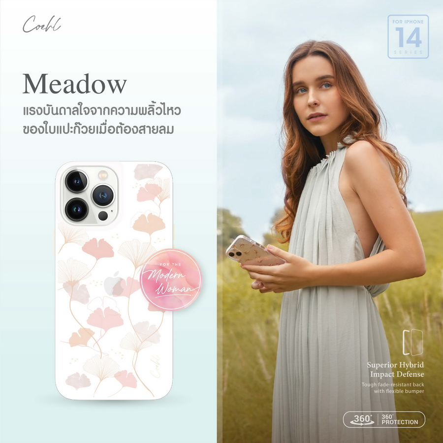 รุ่น Meadow เคสโปร่งแสงที่ได้แรงบันดาลใจมาจากความพลิ้วไหวของใบแปะก๊วยเมื่อต้องสายลมอ่อนๆ มาพร้อมดีไซน์บางเบาและปุ่มสัมผัสที่แม่นยำ ผลิตจากวัสดุ IML TPU COEHL by UNIQ รุ่น Meadow มี 1 สี คือ สี SPRING PINK วางจำหน่ายในราคา 890 บาท