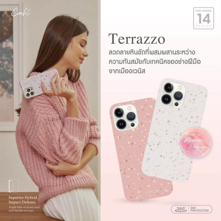 รุ่น Terrazzo เคสที่ผสานความทันสมัยของลายหินขัดและเทคนิคของช่างฝีมือจากเมืองเวนิสได้อย่างลงตัว ผลิตจากวัสดุ IML TPU เนื้อแข็ง ด้านในซับด้วยวัสดุ Microfiber COEHL by UNIQ รุ่น Terrazzo มี 2 สี ได้แก่ สี CORAL PINK และ สี SANDSTONE วางจำหน่ายในราคา 890 บาท
