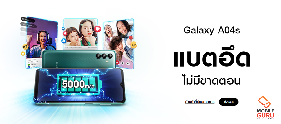 ซัมซุง เปิดตัว Galaxy A04s สมาร์ทโฟนระดับเริ่มต้นใหม่ล่าสุดจากตระกูล A Series อย่างเป็นทางการในประเทศไทยพร้อมสเปคสุดคุ้ม ครอบคลุมทุกการใช้งาน ด้วยแบตเตอรี่อึดถึง 5,000 mAh และกล้องหลักความละเอียด 50MP ถ่ายรูปสวย รายละเอียดคมชัด หน้าจอขนาด 6.5” ความละเอียดระดับ HD+ พร้อมอัตรารีเฟรชเรทสูงถึง 90Hz เครื่องเร็วแรง ในราคาสุดว้าว เพียง 4,999 บาท!