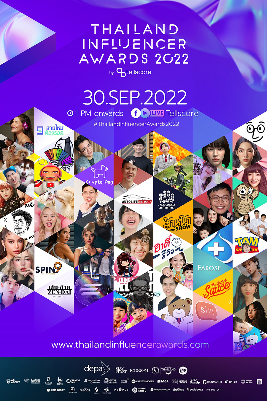 ขอเชิญชวนอินฟลูเอนเซอร์ เหล่าสาวกผู้ติดตาม และนักการตลาดทั่วประเทศ มาร่วมลุ้นผลรางวัลไปพร้อมกันในวันที่ 30 กันยายน 2565 เวลา 13.00 น. เป็นต้นไป ณ ICON HALL ชั้น 7 ICONSIAM และสามารถรับชม LIVE Broadcast ผ่านทางเพจเฟซบุ๊ก www.facebook.com/Tellscore หรือดูรายละเอียดเพิ่มเติมได้ที่ www.thailandinfluencerawards.com หรือ www.tellscore.com