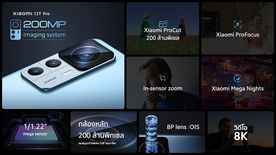 สมาร์ทโฟนเรือธง Xiaomi 12T Series มาพร้อมกล้องระดับโปรที่มอบประสบการณ์การถ่ายภาพที่ยอดเยี่ยมแก่ผู้ใช้งาน โดย Xiaomi 12T Pro ให้ภาพความคมชัดสูงด้วยระบบภาพระดับโปร 200 ล้านพิกเซล ที่ประกอบด้วยฮาร์ดแวร์อันล้ำสมัยและอัลกอริทึม AI ขั้นสูงจากเสียวหมี่ นอกจากนี้ยังช่วยให้คุณสามารถเก็บรายละเอียดภาพได้อย่างดีแม้ในสภาวะแสงน้อย หรือเมื่อถ่ายภาพวัตถุที่เคลื่อนไหวอย่างรวดเร็วโดยไม่สูญเสียการโฟกัส กล้องของ Xiaomi 12T Pro มาพร้อมเซ็นเซอร์ที่ซูมได้ถึง 2 เท่า โดยคุณสมบัตินี้ทำให้ผู้ใช้สามารถใช้ความประโยชน์จากเซ็นเซอร์ขนาดใหญ่ 1/1.22 นิ้ว เพื่อถ่ายภาพบุคคลได้ออกมาอย่างที่ต้องการ และ Xiaomi 12T Pro ยังมาพร้อม Xiaomi ProCut และ Ultra burst ที่จะช่วยให้คุณครอปและสร้างสรรค์เนื้อหาได้อย่างมืออาชีพ ทั้งยังปลดล็อกสกิลความคิดสร้างสรรค์ในถ่ายทำภาพยนตร์ Xiaomi 12T Pro นั้นยังรองรับวิดีโอความละเอียด 8K อีกด้วย สำหรับ Xiaomi 12T นั้น มาพร้อมกล้องสามตัว โดยมีกล้องหลักระดับโปรความละเอียด 108 ล้านพิกเซล กล้องอัลตร้าไวด์ 8 ล้านพิกเซล และกล้องมาโคร 2 ล้านพิกเซล และยังสามารถถ่ายภาพในสภาวะแสงน้อยได้อย่างดี ทำให้ได้ภาพที่สว่างคมชัดแม้ในสภาพแสงที่ท้าทาย