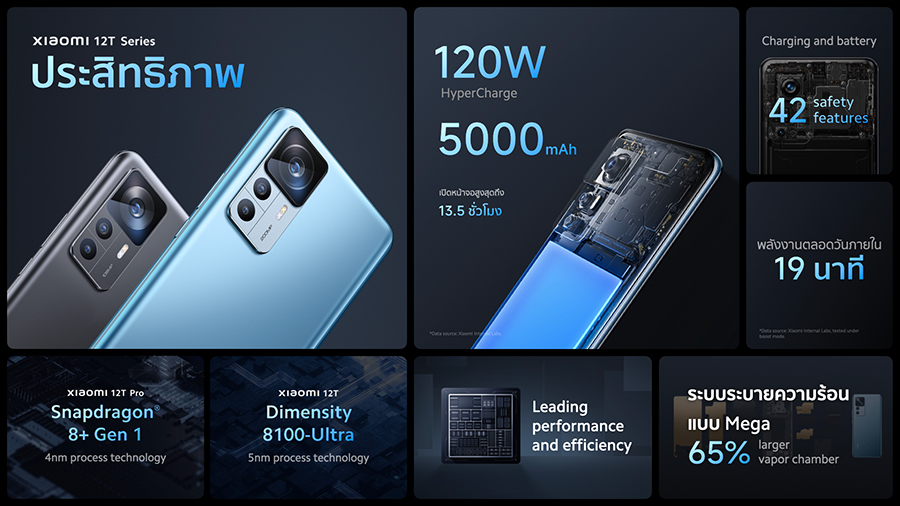 สำหรับด้านประสิทธิภาพการประมวลผลนั้น Xiaomi 12T Pro มาพร้อมโปรเซสเซอร์ Snapdragon® 8+ Gen 1 ด้วยกระบวนการผลิต 4nm TSMC ช่วยเพิ่มประสิทธิภาพการทำงานของ CPU และ GPU ได้มากถึง 16.7% และ 11% ตามลำดับ เมื่อเทียบกับ Snapdragon 8 Gen 1 และลดการใช้พลังงานของแต่ละตัวลงถึง 33% และ 30% นอกจากนี้ยังมีระบบระบายความร้อนที่ประกอบไปด้วยส่วนห้องไอน้ำที่ใหญ่ขึ้นถึง 65% และมีการใช้วัสดุกันความร้อนที่คลอบคลุมตัวอุปกรณ์มากกว่า Xiaomi 11T Pro ถึง 125% Xiaomi 12T Pro จึงมอบประสบการณ์การใช้งานที่ราบรื่นและประสิทธิภาพพลังงานที่ยอดเยี่ยมโดยที่คุณไม่จำเป็นต้องกังวลเรื่องความร้อนสูงเกินอีกต่อไป และสำหรับ Xiaomi 12T นั้น ขับเคลื่อนด้วยชิปเซ็ต MediaTek Dimensity 8100-Ultra ซึ่งสร้างขึ้นจากกระบวนการผลิต 5nm TSMC ตัวชิปนั้นได้รับการอัปเกรดด้วยโครงสร้าง GPU ใหม่ทั้งหมด จึงเพิ่มประสิทธิภาพและประสิทธิภาพการใช้พลังงานได้ถึง 30% เมื่อเทียบกับรุ่นก่อน ตลอดจนความเร็วนาฬิกา แคช และการจัดเก็บ ทำให้ผู้ใช้งานได้รับประสบการณ์การใช้งานที่รวดเร็วยิ่งขึ้น2 ไม่ว่าจะเป็นการถ่ายภาพและวิดีโอ การดูภาพยนตร์ หรือเล่นโซเชียลมีเดีย Xiaomi 12T ก็ให้คุณใช้งานด้วยประสิทธิภาพสูงสุดในทุกๆ ช่วงเวลาของคุณ