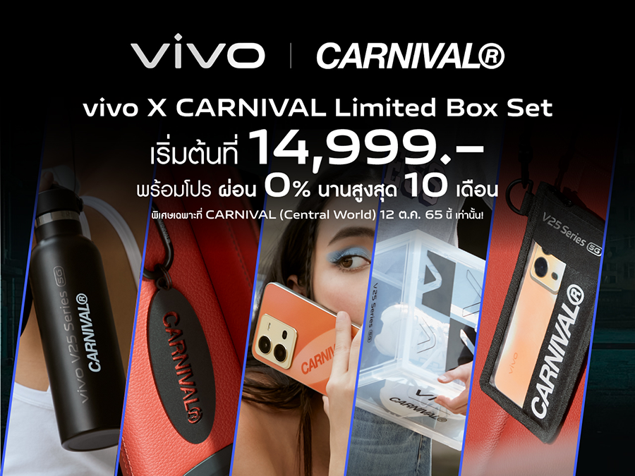 ใครที่เป็น vivo fans สายสตรีต ห้ามพลาดเด็ดขาด! กับ vivo V25 Series 5G คอลเลกชันลิมิเต็ดที่ทาง vivo แบรนด์สมาร์ตโฟนชั้นนำระดับโลก ประกาศจับมือกับ CARNIVAL แบรนด์สตรีตแฟชั่นระดับแถวหน้าของเมืองไทย เปิดตัว CARNIVAL Limited Box Set ออกแบบพิเศษมาสำหรับสมาร์ตโฟน V25 Series 5G โดยเฉพาะ ล่าสุดทาง vivo ยังเตรียมส่งโปรโมชันเอาใจสายสตรีต ให้ได้เป็นเจ้าของ vivo V25 Series 5G สเปกครบครัน ในราคาคุ้มค่าเริ่มต้นที่ 14,999 บาท พร้อมผ่อน 0% นานสูงสุด 10 เดือน กับธนาคารชั้นนำที่ร่วมรายการ ได้แก่ ธนาคารกรุงไทย, กรุงศรี, ไทยพาณิชย์, กสิกร และธนาคารกรุงเทพ ซึ่งเงื่อนไขเป็นไปตามที่ธนาคารกำหนด