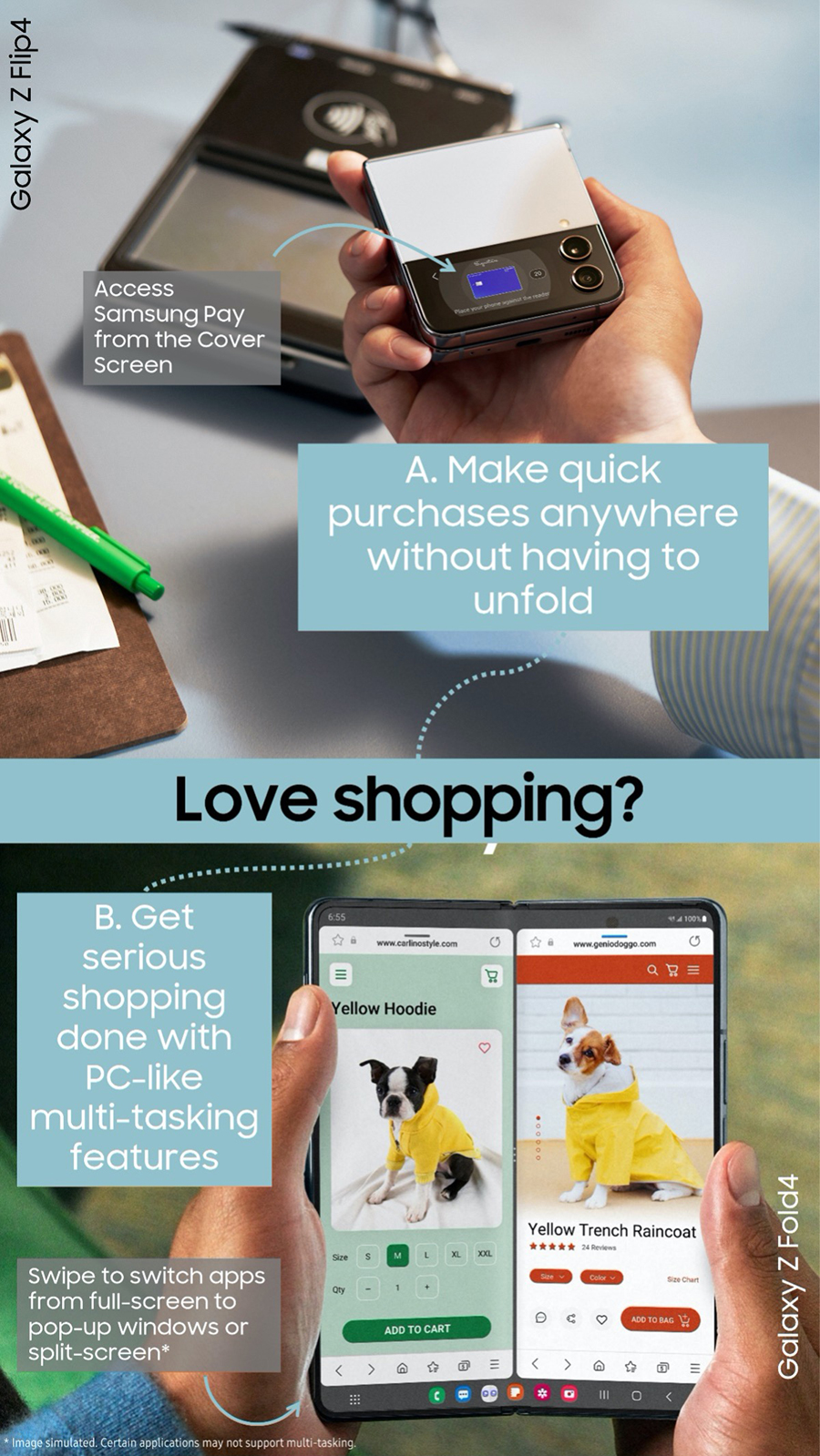 Galaxy Z Fold4 เป็นสมาร์ทโฟนที่เหนือกว่าอีกขั้นด้วยคุณสมบัติการทำงานหลายอย่างพร้อมกันอย่างเต็มประสิทธิภาพสำหรับทั้งการทำงานและกิจกรรมเพื่อความสนุกสนานต่างๆ สมาร์ทโฟนรุ่นนี้เป็นสุดยอดสมาร์ทโฟนสำหรับการประกอบอาหาร สร้างสรรค์งานศิลป์ หรือการเปรียบเทียบข้อเสนอพิเศษต่างๆ ด้วยรูปลักษณ์ของตัวสมาร์ทโฟนที่พับได้ รวมถึงหน้าจอคุณภาพสูงที่ รวมถึงคุณสมบัติการทำงานหลายอย่างพร้อมกันเสมือนคอมพิวเตอร์ส่วนบุคคล นอกจากนี้กล้องถ่ายภาพที่ยกระดับขึ้นอีกขั้นช่วยให้การถ่ายภาพตัวเองขณะทำสิ่งต่างๆ ได้แบบคุณภาพสูงสุด และสามารถนำภาพนั้นไปโพสต์ลงโซเชียลมีเดียหรือเพื่อการทำงานได้ดั่งใจ