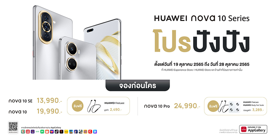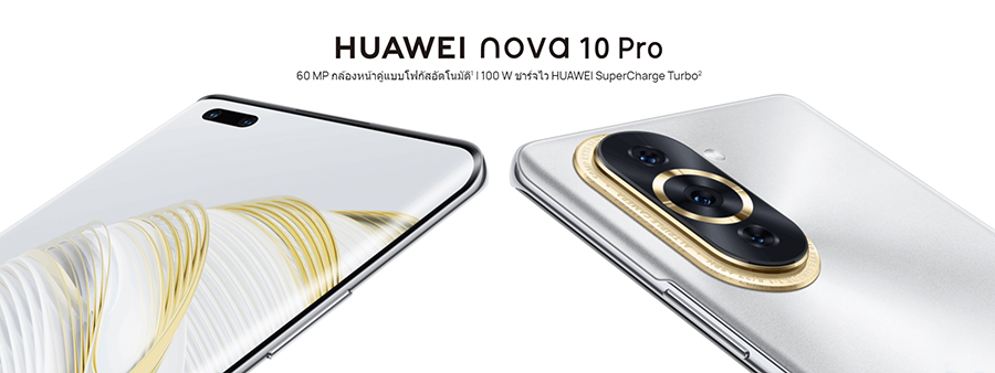 หัวเว่ย คอนซูมเมอร์ บิสสิเนส กรุ๊ป (ประเทศไทย) เดินหน้าบุกตลาดสมาร์ทโฟนอย่างต่อเนื่องเปิดตัว HUAWEI nova 10 Series สมาร์ทโฟนที่ออกแบบมาเพื่อตอบโจทย์เทรนด์คนรุ่นใหม่สายคอนเทนต์ครีเอเตอร์ ซึ่งเปิดตัวพรัอมกันทั้งหมด 3 รุ่น ได้แก่ HUAWEI nova 10 Pro มาพร้อมกล้องหน้าคู่ดูโอ้ความละเอียดสูงสุด 60MP สามารถถ่ายวิดีโอแบบ Auto-focus หน้าชัดหลังเบลอได้อัตโนมัติ รวดเร็วไปกับระบบชาร์จไวสูงถึง 100W HUAWEI SuperCharge Turbo ที่สุดของสมาร์ทโฟนหัวเว่ยที่มีความบางเบาพียง 6.88 มม กับ HUAWEI nova 10 ถูกใจสายเซลฟี่ด้วยกล้องหน้าคมชัด 60MP พร้อมฟีเจอร์เอาใจสายคอนเทนต์เพียบ รองรับชารจ์ไว 66W และรีเฟรชเรตสูงสุด 120Hz และ HUAWEI nova 10 SE สมาร์ทโฟนจัดเต็มกับกล้องหลังทรงพลัง 108MP ดีไซน์สวยเพรียวบาง รองรับชาร์จไว 66W HUAWEI SuperCharge บนแบตเตอรี่ขนาดใหญ่ 4500mAh HUAWEI nova 10 Series วางจำหน่ายในราคาเริ่มต้นที่ 13,990 บาท พร้อมโปรโมชันพรีออเดอร์รับของสมนาคุณตั้งแต่วันที่ 19 - 28 ตุลาคม 2565 ทาง HUAWEI Experience Store ร้านค้าตัวแทนจำหน่ายที่ร่วมรายการทั่วประเทศ รวมทั้งช่องทางออนไลน์ที่ HUAWEI Store และร้านค้าออนไลน์อย่างเป็นทางการของหัวเว่ยใน Shopee และ Lazada