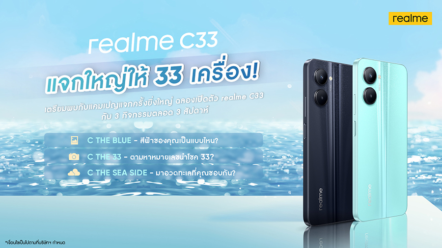 ไม่เพียงเท่านั้น! เรียลมียังใจปล้ำ จัดกิจกรรม "realme C33 แจกใหญ่ให้ 33 เครื่อง" โดยให้เรียลแฟนทุกท่านได้ร่วมสนุกเพื่อลุ้นรับสมาร์ตโฟนน้องใหม่ realme C33 ถึง 33 เครื่องกับ 3 กิจกรรมที่จะให้คุณได้ Shine on Your Sea Side ตลอด 3 สัปดาห์