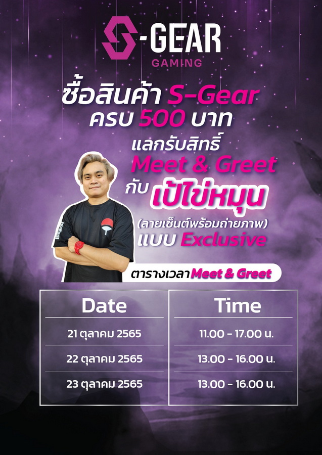 พร้อมสัมผัสประสบการณ์ใหม่กับการทดลองใช้สินค้าไฮไลท์ของแบรนด์ S-GEAR ในงาน Thailand Game Show 2022 วันที่ 21-23 ตุลาคม 2565, Exhibition Hall 3-4 ชั้น G (P2) ณ ศูนย์การประชุมแห่งชาติสิริกิติ์