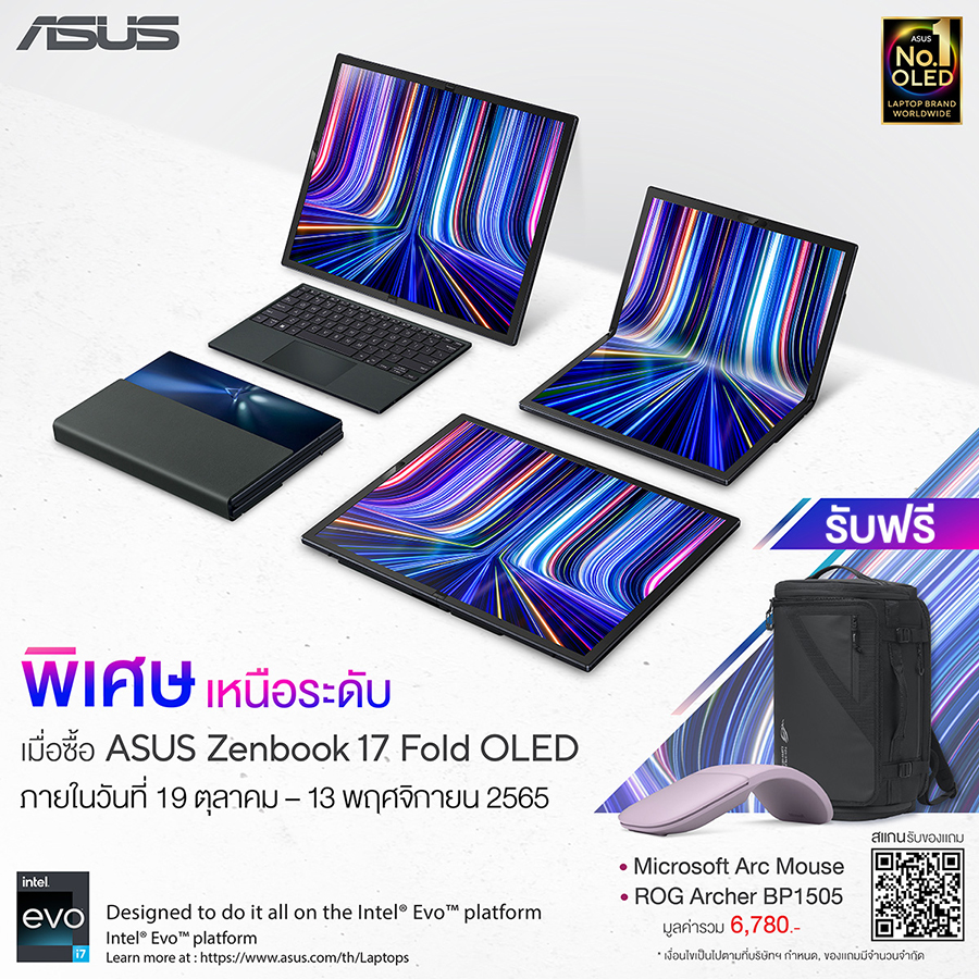 พิเศษ! เมื่อสั่งซื้อ ASUS Zenbook 17 Fold OLED ภายในวันที่ 19 ตุลาคม - 13 พฤศจิกายน 2565 ลงทะเบียนรับฟรี* Microsoft Arc Mouse และ ROG Archer BP1505 มูลค่ารวม 6,780 บาท ที่ th.asus.click/WmBrir