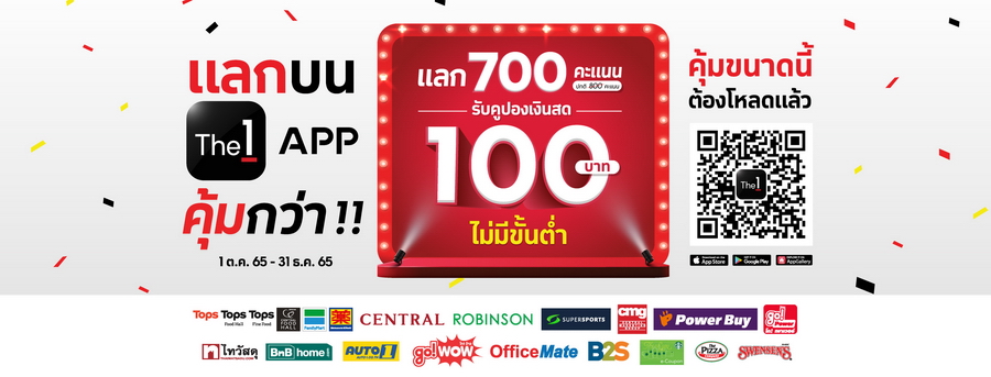 The 1 มุ่งสานต่อพันธกิจที่ จะมอบความคุ้มค่าในการช้อปผ่าน The 1 APP ด้วยแคมเปญล่าสุด “แลกบน The 1 APP คุ้มกว่า” ที่ได้ขยายและรวบรวมเอาดีลที่ดี ที่สุดตลอดปีมานำเสนอให้กั บสมาชิก The 1 โดยจับมือกับแบรนด์พาร์ทเนอร์ทั้ งในและนอกเครือเซ็นทรัลที่ต่ างยกขบวนดีลที่ครอบคลุมทุ กความต้องการที่สุดตลอดปี สามารถแลกได้ในทุกๆ วัน ทุกที่ทุกเวลา และครอบคลุมทุกความสนใจ เริ่มต้นที่รีวอร์ดที่มาในเรตพิ เศษสุด 700 คะแนน แลกรับส่วนลด 100 บาท (จากปกติ 800:100) ไม่มีขั้นต่ำในการใช้คูปอง สมาชิก The 1 สามารถเลือกแลกได้จากทั้ง The 1, Central, Tops, Robinson, Supersports, Power Buy, go!WOW, BnB home, AUTO 1, Thai Watsadu, B2S, CMG, FamilyMart, OfficeMate, Starbucks, Swensen's และ The Pizza Company ตั้งแต่วันนี้ – 31 ธ.ค. 2565 นอกจากนี้ยังมีรีวอร์ ดหลากหลายจากพาร์ทเนอร์ มากมายกว่า 2,000 แบรนด์ที่สับเปลี่ยนหมุนเวียนกั นมามอบสิทธิพิเศษให้กับสมาชิก The 1 ผ่าน The 1 APP โดยเฉพาะ