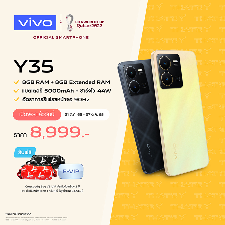 vivo แบรนด์สมาร์ตโฟนชั้นนำระดับโลก เปิดโอกาสให้แฟนๆ ได้จับจองเป็นเจ้าของ vivo Y35 สมาร์ตโฟนรุ่นใหม่ตระกูล Y Series ก่อนใคร! มาพร้อมสเปกใหม่แบบจัดเต็ม สัมผัสประสบการณ์การใช้งานอย่างไหลลื่น มาพร้อมหน้าจอแสดงผล FHD+ ขนาด 6.58 นิ้ว รีเฟรชเรท 90Hz ให้มุมมองที่กว้าง สมจริง สำหรับทั้งวิดีโอและเกม รองรับหน่วยความจำ RAM 8GB เสริมทัพด้วย Extended RAM อีก 8GB รวมถึงแบตเตอรี่ความจุ 5,000 mAh รองรับเทคโนโลยีชาร์จไว 44W ช่วยให้การใช้งานสมาร์ตโฟนของคุณลื่นไหลไม่มีสะดุด