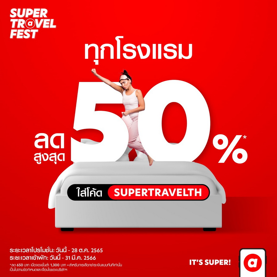 เพลิดเพลินกับข้อเสนอสุดพิเศษด้วยส่วนลดสูงสุดถึง 50% จากโรงแรมชั้นนำมากมาย ณ จุดหมายปลายทางยอดนิยมทั่วโลก และอื่นๆ อีกมากมายตลอดช่วงโปรโมชั่น “SUPER Travel Fest” อย่าลืมใส่รหัส “SUPERTRAVELTH” ที่หน้าชำระเงิน