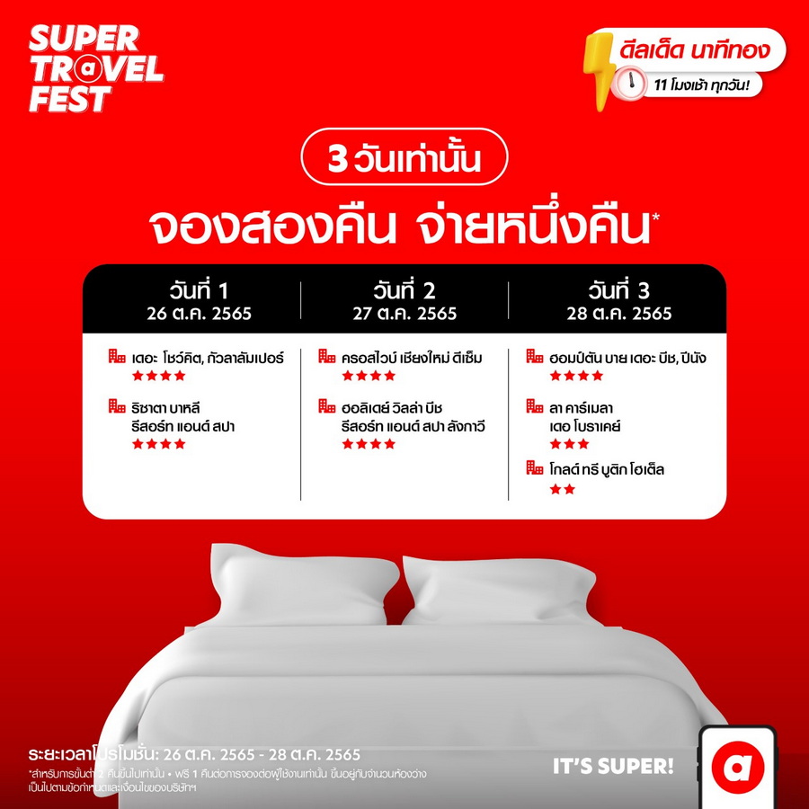 ลดกระหน่ำไปอีกกับนาทีทอง SUPER Hour Deals ในช่วงเวลา 11.00 น. – 12.00 น. ของวันที่ 26-28 ตุลาคม 2565 นี้ ผู้ใช้บริการ airasia Super App จะได้รับห้องพักฟรี 1 คืน! เมื่อจองห้องพักอย่างน้อย 2 คืน ในโรงแรมชั้นนำระดับท็อป ในลังกาวี ปีนัง กัวลาลัมเปอร์ เชียงใหม่ โบราเคย์ และบาหลี