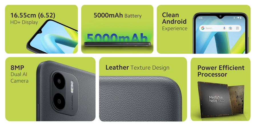 Redmi A1 ขับเคลื่อนด้วย MediaTek Helio A22 ที่ให้ประสิทธิภาพในการประมวลผลและใช้งานแอปพลิเคชั่นต่างๆ โดยรองรับการแสดงผลที่มีความละเอียดสูงและประหยัดพลังงาน นอกจากนี้ยังรองรับพื้นที่จัดเก็บที่ขยายได้สูงสุดถึง 1TB ซึ่งช่วยเพิ่มพื้นที่ว่างให้สมาร์ทโฟนของคุณในการจัดเก็บข้อมูลเพิ่มขึ้นอีกด้วย