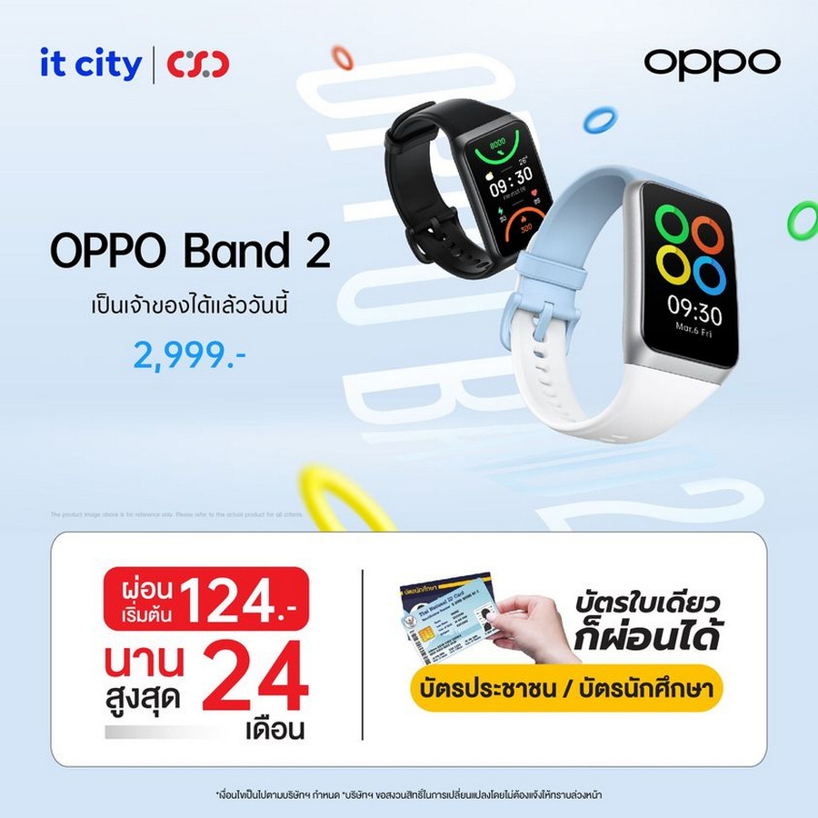 OPPO Band 2 ยังมาพร้อมกับฟีเจอร์เพื่อสุขภาพอีกมากมาย จะเปิดตัวอย่างเป็นทางการ วันที่ 1 พฤศจิกายน 2565 แต่ล่าสุด IT City และ CSC ก็เปิดราคามาแล้วนะครับ 2,999 บาท ผ่อนเริ่มต้น 124 บาท นานสูงสุดถึง 24 เดือน เลยทีเดียว!