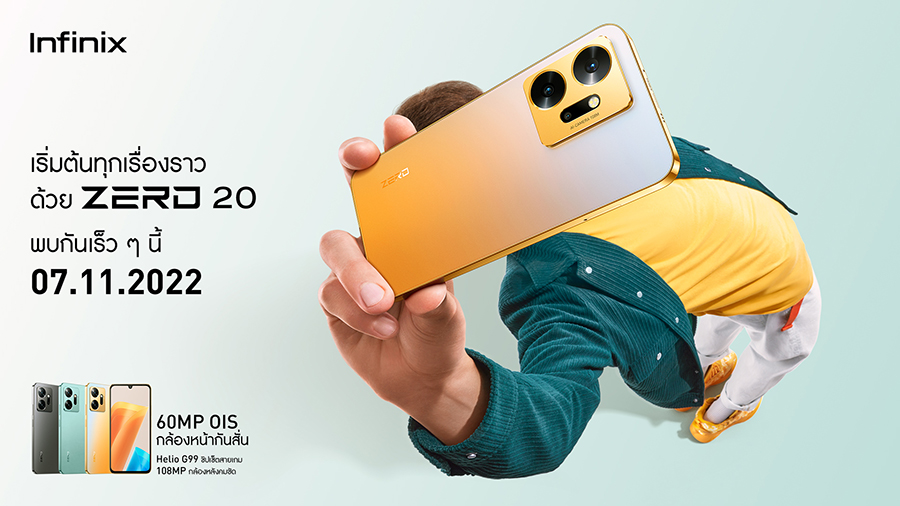 อินฟินิกซ์ (Infinix) เตรียมเปิดตัวสมาร์ตโฟนสายกล้องระดับพรีเมียมรุ่นใหม่ล่าสุด Infinix ZERO 20 กับสโลแกน "Capture Your Own Story from ZERO 20 – เริ่มต้นทุกเรื่องราวด้วย ZERO 20" ชูจุดขายเป็นสมาร์ตโฟนรุ่นแรกของโลกที่มีกล้องหน้าระบบกันสั่นแบบ OIS ความละเอียด 60 ล้านพิกเซล กล้องหลังคมชัด 108 ล้านพิกเซล เพื่อมอบประสบการณ์การใช้งานที่ล้ำกว่าและตอบโจทย์ผู้ใช้งานที่ชื่นชอบการถ่ายภาพด้วยกล้องมือถือในช่วงเรทราคาไม่เกิน 8,000 บาท พร้อมผสานพลังกับโปรเซสเซอร์ MediaTek Helio G99 ที่ให้หน่วยพื้นที่ความจำตัวเครื่องสูงถึง 256GB และ RAM 8GB + 5GB ถือเป็นผลงานการออกแบบที่ยกระดับทุกการใช้งานให้กับทุกคนได้อย่างลงตัว
