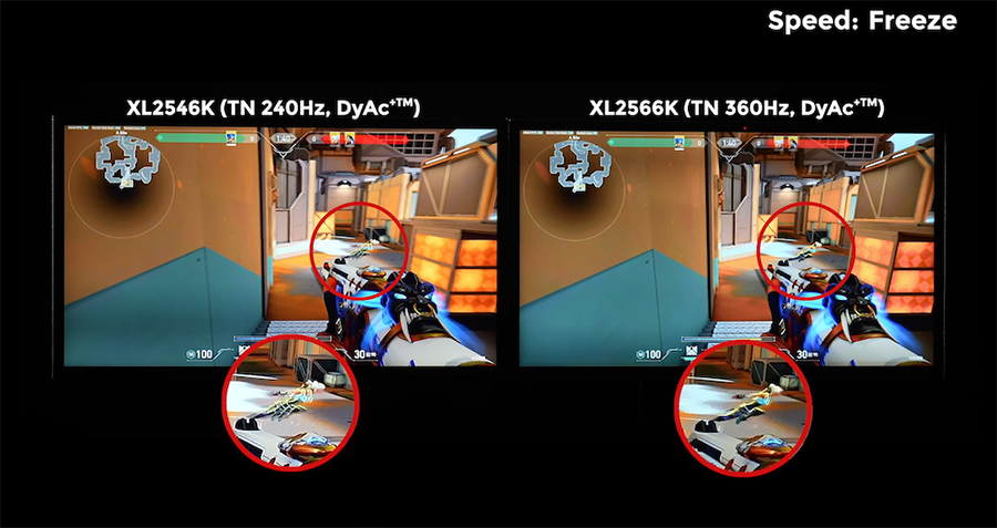 เทคโนโลยี DyAc⁺™ ใน XL2566K ทำให้แอ็กชันในเกมโดยเฉพาะเกมกลุ่ม FPS ดูน่าตื่นเต้นด้วยภาพที่คมชัดกว่าเทคโนโลยี DyAc⁺™ ในจอรุ่นก่อนอย่าง XL2546K เพราะภาพที่คมชัดขึ้นจะช่วยให้เกมเมอร์สามารถมองเห็นตำแหน่งของศัตรูที่เคลื่อนไหวอย่างรวดเร็วหรือเป้าเคลื่อนที่เร็วได้ง่ายขึ้น ทั้งยังมองเห็นวิถีกระสุนได้ชัดเจนกว่า ซึ่งช่วยในการควบคุมแรงดีดของอาวุธและการเล็งเป้าหมายที่แม่นยำ เมื่อเปรียบเทียบกับจอ IPS 360Hz ทั่วไป เทคโนโลยี DyAc⁺™ ในจอ 360Hz จะแสดงภาพวัตถุเคลื่อนไหวที่มีเส้นขอบคมชัดกว่า ช่วยให้คุณโฟกัสและลดความไขว้เขวที่เกิดจากอาการภาพติดตา (Afterimage) ในเกมที่มีการเคลื่อนไหวสูง