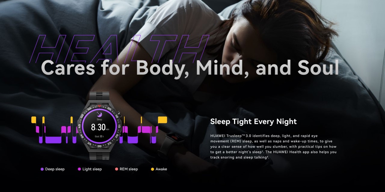 HUAWEI TruSleep™ 3.0 เป็นอีกส่วนหนึ่งใน HUAWEI Tru-series ที่ใช้เทคโนโลยีชั้นนำของอุตสาหกรรมโดยใช้แสงอินฟราเรดเพื่อติดตามการนอนพร้อมการตรวจจับระยะเวลาการนอนหลับของผู้ใช้โดยอัตโนมัติ ซึ่งสามารถตรวจสอบระยะการนอนหลับได้ 4 ระดับ ได้แก่ ระยะหลับไม่สนิท ระยะหลับลึก ระยะหลับฝัน REM และระยะตื่นขึ้นมาช่วงสั้นๆ ผ่านการวิเคราะห์ตามการเคลื่อนไหวของร่างกาย อัตราการเต้นของหัวใจ และ HRV ยังมาพร้อมฟีเจอร์ใหม่ในแอป HUAWEI Health ที่สามารถบันทึกคุณภาพการนอนหลับ การละเมอสนทนาขณะนอนหลับ และติดตามการกรน เพื่อให้ผู้ใช้ได้รับข้อมูลเชิงลึกที่เป็นประโยชน์เกี่ยวกับพฤติกรรมการนอนและสามารถให้คำแนะนำมากกว่า 200 รายการเพื่อปรับปรุงคุณภาพการนอนหลับให้ดียิ่งขึ้น นอกจากนี้ยังมาพร้อมเทคโนโลยี HUAWEI TruSeen™ 5.0 + สำหรับวัดค่าอัตราการเต้นของหัวใจและค่าความอิ่มตัวของออกซิเจนในเลือด (SpO2) อัตโนมัติตลอดวันได้อย่างแม่นยำยิ่งขึ้น