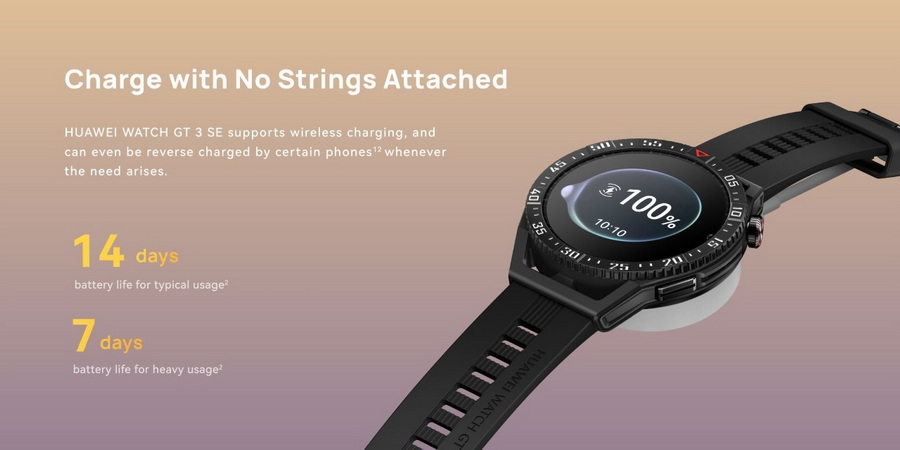 HUAWEI WATCH GT 3 SE คงคอนเซ็ปต์อายุการใช้งานแบตเตอรี่ที่ยาวนานเป็นพิเศษในตระกูล WATCH GT Series ด้วยการพัฒนาแบตเตอรี่ใหม่ทำให้รองรับการใช้งานทั่วไปต่อเนื่องนานสูงสุด 2 อาทิตย์ และการใช้งานแบบหนักหน่วงต่อเนื่องสูงสุด 7 วัน รองรับการชาร์จไร้สายและเทคโนโลยีชาร์จเร็วที่สามารถใช้งานได้เต็มวันด้วยการชาร์จเพียง 5 นาที และรองรับการชาร์จแบบ Reverse Charging โดยแตะ HUAWEI WATCH GT 3 SE เข้ากับสมาร์ทโฟนของหัวเว่ยที่รองรับการชาร์จแบบเดียวกัน เพื่อรับพลังงานจากสมาร์ทโฟน โดยไม่ต้องพึ่งแท่นชาร์จ ในขณะเดียวกันจากฐานชาร์จแบบไร้สายไม่มีหน้าสัมผัสที่เป็นโลหะ จึงช่วยลดโอกาสการแพ้ที่ผิวหนังได้อีกด้วย อีกทั้งยังมอบประสบการณ์อัจฉริยะที่ช่วยให้คุณใช้ชีวิตสะดวกสบายยิ่งขึ้นด้วยฟีเจอร์ Bluetooth calls สามารถรับสาย-โทรออกได้ด้วย HUAWEI WATCH GT 3 SE ตอบกลับข้อความ ค้นหาข้อมูล ควบคุม music playback ติดตามกการออกกำลังกาย และอื่นๆ ที่ทำได้อย่างง่ายดายที่ข้อมือ ก้าวข้ามขอบเขตของสมาร์ทวอช์ทครอบคลุมทุกแง่มุมของไลฟ์สไตล์