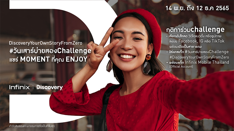 อินฟินิกซ์ (Infinix) แบรนด์สมาร์ตโฟนระดับโลกที่ออกแบบมาเพื่อตอบโจทย์ไลฟ์สไตล์คนรุ่นใหม่ จับมือ Discovery จัดกิจกรรม "วันเสาร์บ่ายสองChallenge" เพื่อสร้างแรงบันดาลใจให้ทุกคนออกไปท่องเที่ยวและค้นหาประสบการณ์ใหม่ๆ พร้อมสร้างสรรค์คอนเทนต์และบันทึกช่วงเวลาแห่งความสนุกด้วยโทรศัพท์มือถือและนำมาแชร์ส่งต่อความประทับใจ โดยเรื่องราวและโมเมนต์ของใครโดนใจที่สุด รับรางวัลพิเศษสมาร์ตโฟนรุ่นใหม่ล่าสุด Infinix ZERO 20 จำนวน 3 รางวัล สามารถร่วมกิจกรรมได้ตั้งแต่วันที่ 14 พฤศจิกายน - 12 ธันวาคม 2565