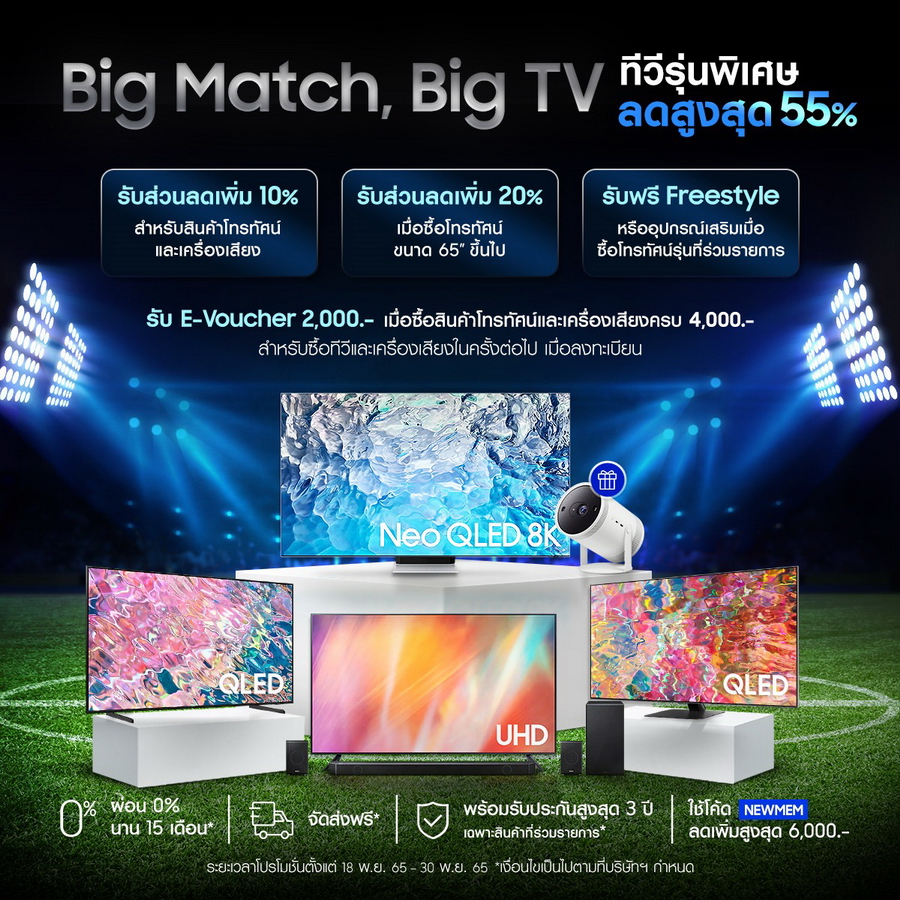 โปรโมชั่น BIG MATCH BIG TV เริ่ม วันที่ 18-30 พฤศจิกายน 2565 สำหรับการสั่งซื้อทีวีและเครื่องเสียงบนเว็บไซต์ samsung.com สามารถดูรายละเอียดผลิตภัณฑ์กลุ่มจอภาพจากซัมซุงเพิ่มเติมได้ทาง https://www.samsung.com/th/
